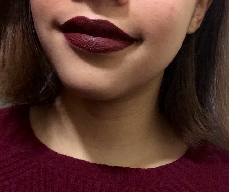 This may not be the best photo but this is me wearing Wicked Velvetine on New Years Day. I simply adore how it looks on my skin tone and how it has a brown undertone on top of the beautiful Burgundy Red.
