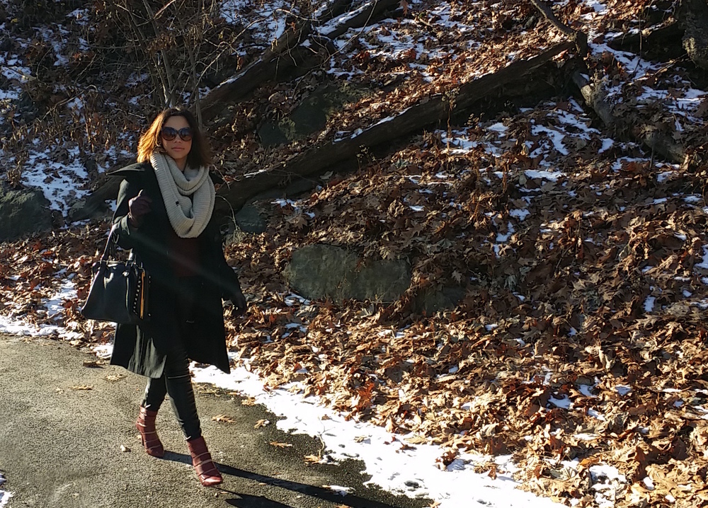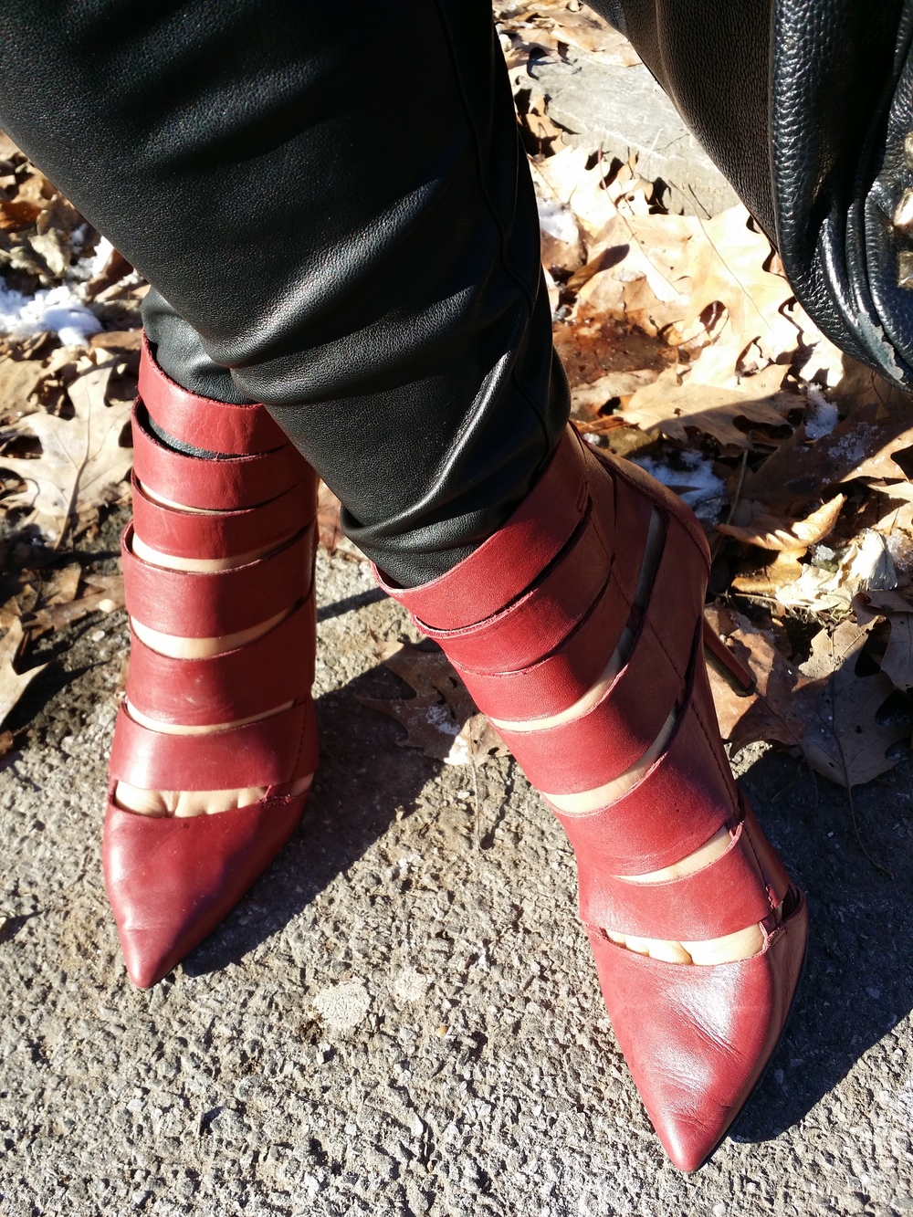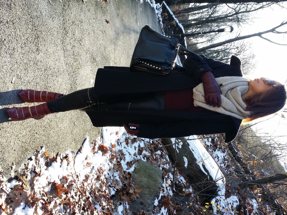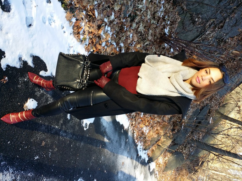 As if today could not be any longer. The sun this morning had everything feeling ever so warm until it began to drop right after we took these photos today. Burgundy color has become one of my favorites for this winter season just because how great it looks on my skin. It is very similar to the color of my last post of Wicked Lime Crime. That blood red almost brown look has really caught on for this winter with its sad gloomy weather. The boots have definitely become a staple item to me as i have already worn them a few times with how comfortable they are. The heel is not so high and just the right length, along with the soft leather strapping around my foot just making it all feel warm. I love and have adored how they look along with my Leather Trousers and how I can simply just tuck in the pants into my shoes without any bother. My mother and I have been the same size for many many years (its like she never grows lol) and we share our coats. This particularly is one of my mothers vintage Guess style coat which has also become a staple in my closet. Well as the night comes to close, stay all warm and thanks for visiting.