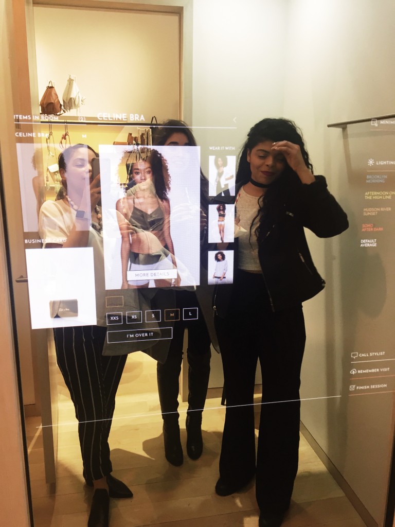 My friends Liliana and Natalie fell in love with the virtual interaction by the entrance of the store and throughout every fitting room. It makes trying on items so much more simple and quick! Once you enter, you can go to the main screen and click on the different items the store has available and pick what you would like to try on. Once in the fitting room, RFID sensor which activates fitting room upon entrance. It reads what style and size you have and lets you review other items that can go along with that specific style or add new things to try on. You can set the mood by selecting different lighting, requesting a different style and size, or simply an amazing selfie!!! Basically, don’t have to leave the fitting room to find another size or style! Shopping made easy. Check out the video below while testing the different lighting and learning more on the fitting room customization.