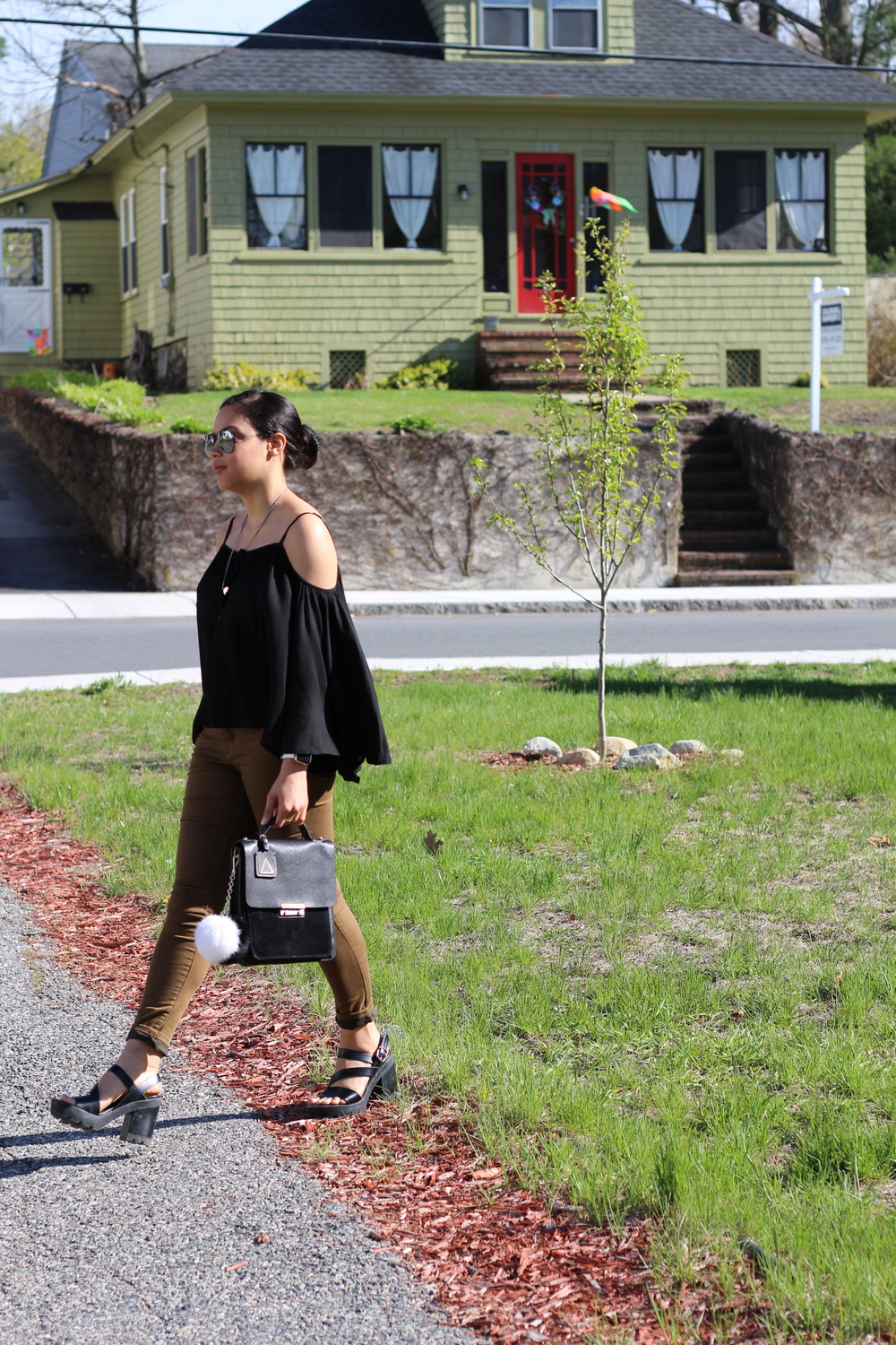 TOP: Lorel Off Shoulder Top | Pants: Forever 21 | Bag: Kelsi Dagger Brooklyn | Pom Pom: DVF | Shoes: Aldo | Necklace:Zara | Shades: RayBans Aviators