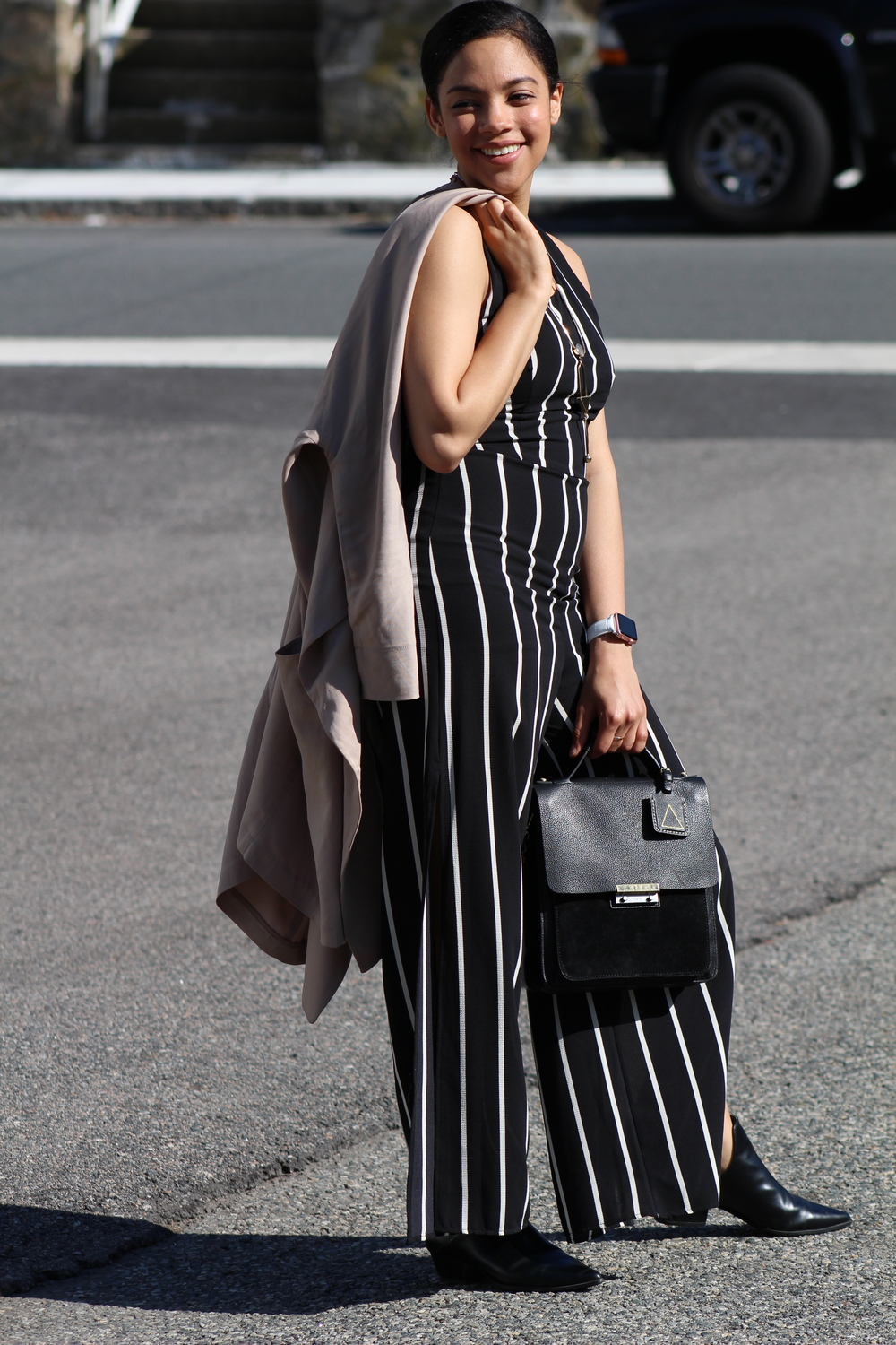 Duster Jacket and Shoes: Zara | Jumpsuit: Judy Jumpsuit | Bag: Kelsi Dagger Brooklyn | Watch: Apple |