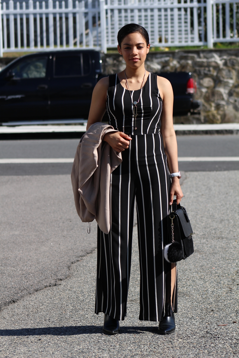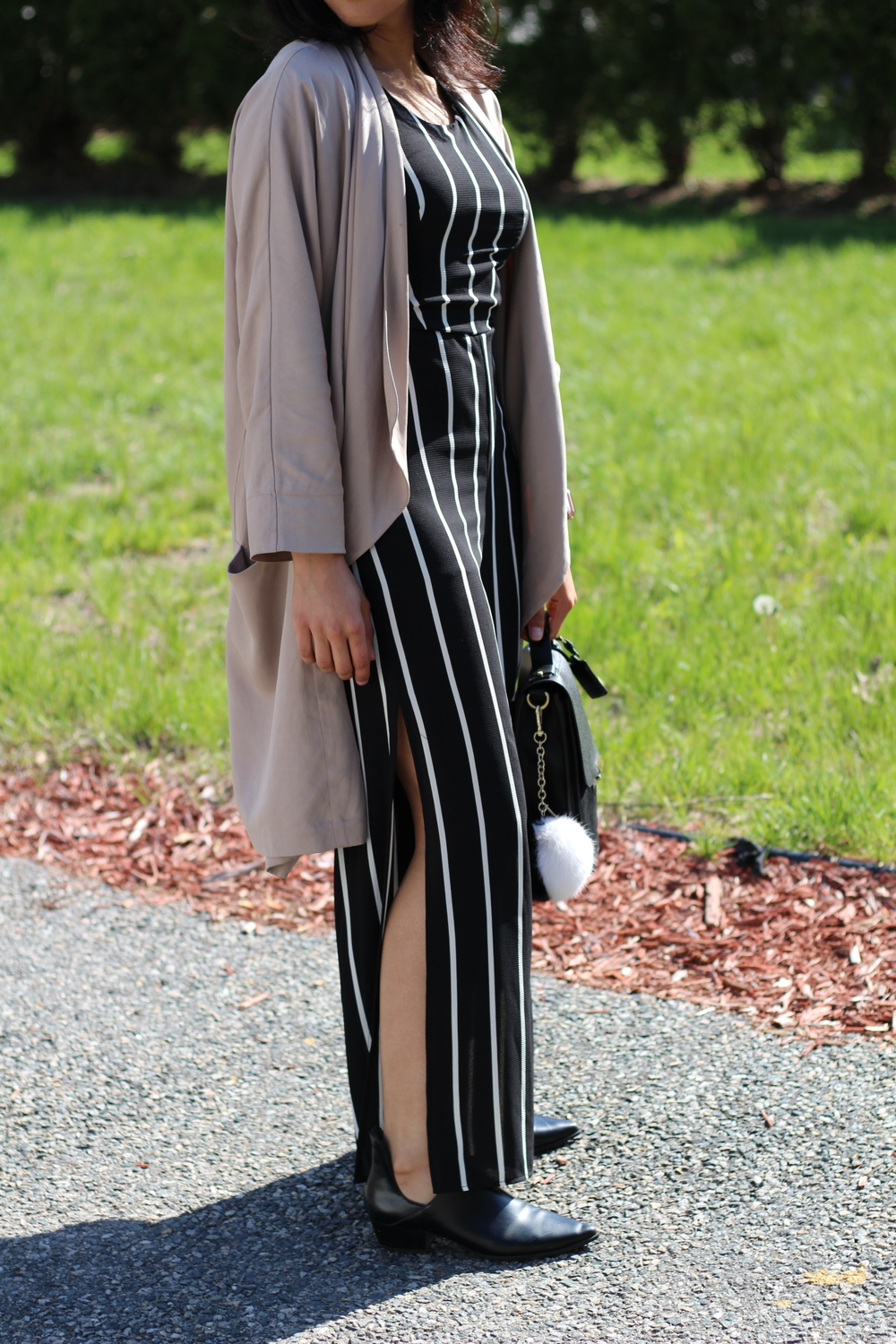 This stripe jumpsuit is becoming a staple in my closet!perfect lightweight fabric for the spring/summer season along with side splits from the knees down on each leg! This jumpsuit is available now in the shop section of this site. I layered this dress with some flat boots to walk around and a Zara Shawl to keep warm before the sun truly started hitting in.